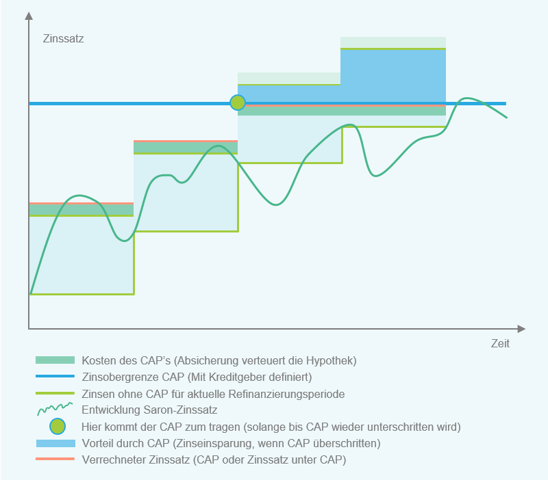Wie die Grafik zeigt, kann der CAP vor stark steigenden Zinsen schützen. In der Grafik wird davon ausgegangen, dass der Zinssatz bei Saron-Hyotheken für eine gewisse Abrechnungszeit konstant bleibt. Je Nach Abrechnungsmethode wird der CAP technisch unterschiedlich abgebildet werden. Der Nutzen des CAP ist aber bei allen Abrechnungsmethoden ähnlich und es handelt sich nur um eine technische Feinheit.